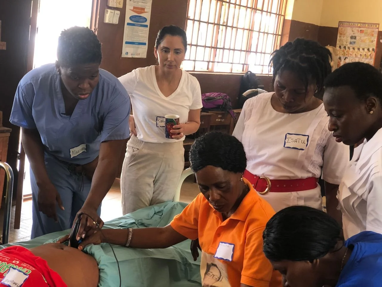 Drs. Valdez and Massaquoi-Gartmann teach 10 community health workers and midwives from Gbaiima, Gondama and Monghere clinics how to do focused OB ultrasound to diagnose high-risk conditions that require referral to a higher level of care